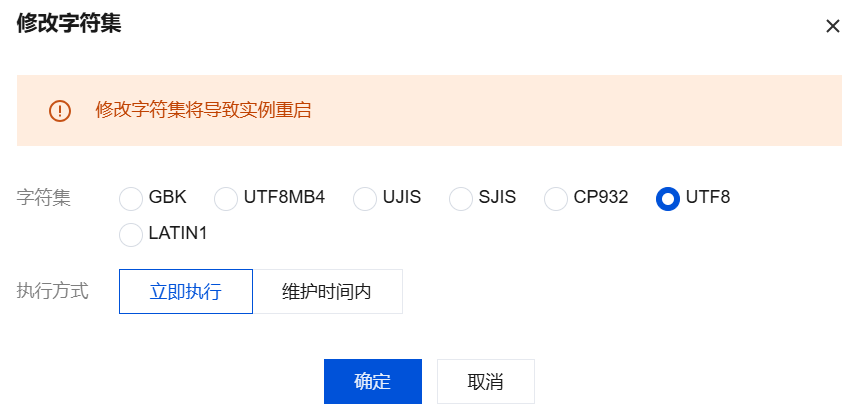 执行方式:支持选择立即执行或者维护时间内。选择立即执行,表示立即修改字符集;选择维护时间内,表示在实例的维护时间内变更字符集,如需修改实例的维护时间,请参见 修改实例维护时间。