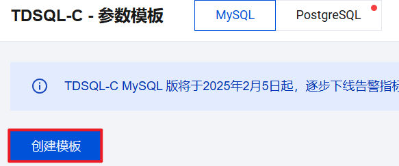 1. 登录 TDSQL-C MySQL 版控制台,在左侧导航选择参数模板页面,然后单击创建模板。