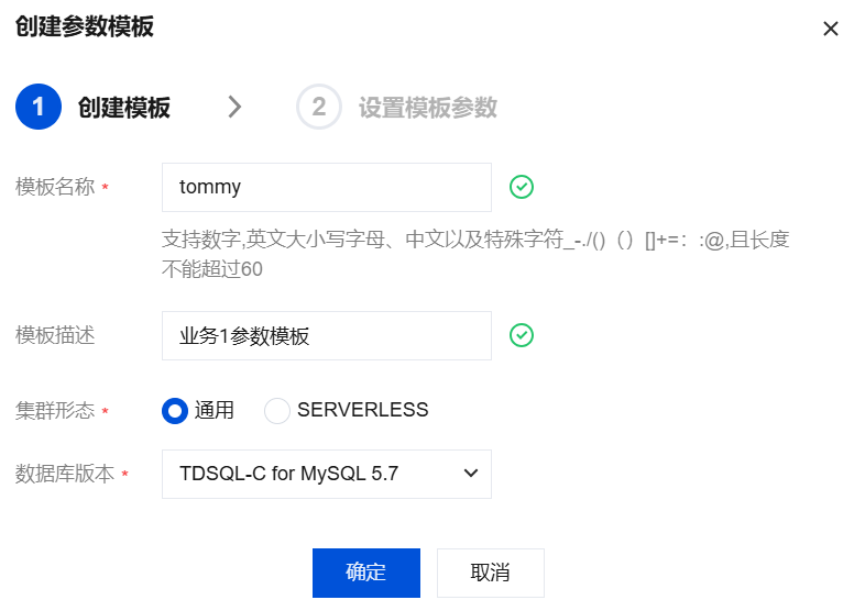 模板名称 | 输入参数模板的名称,参数模板名称具有唯一性。支持数字、英文大小写字母、中文以及特殊字符_-./()()[]+=::@,且长度不能超过60字符。 |