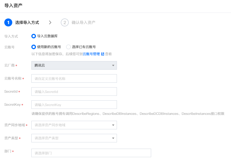 云账号 | | 选择导入云数据库的账号方式: 使用新的云账号:选择使用新的云账号时,需要您输入云厂商、云账号名称、SecretId、SecretKey。资产导入成功后,系统会将账号信息保存至 混合云账号管理 模块,便于后续账号管理与设置资产自动同步。 选择已有的云账号:选择您已添加的云账号,可在 混合云账户管理 界面对账号进行管理和维护。 |