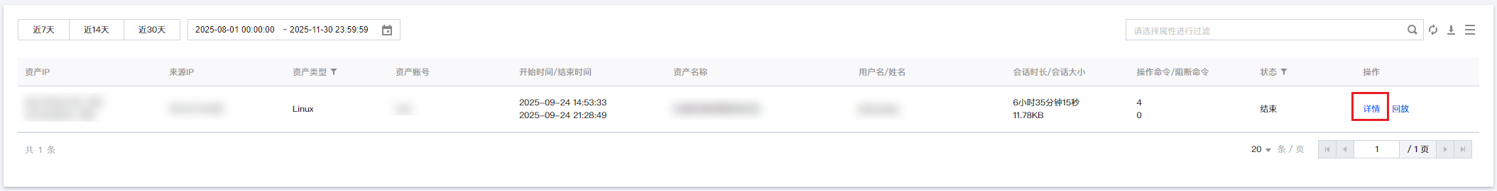 4. 在字符会话页面,单击对应会话右侧的详情,可打开会话详情页面。