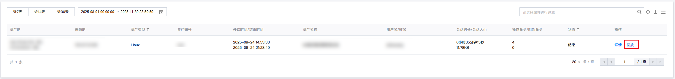 6. 在字符会话页面,单击对应会话右侧的回放,可在新的页面回放历史会话,还原用户真实操作行为。