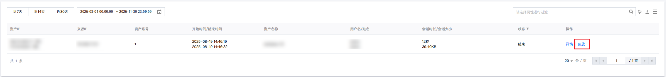 6. 在图形会话页面,单击对应会话右侧的回放,可在新的页面回放历史会话,还原用户真实操作行为。