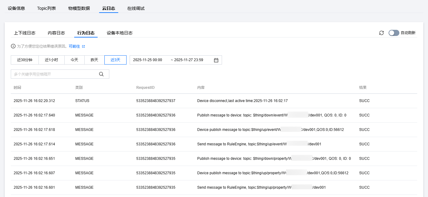 物联网开发平台云日志模块提供全方位稳定可靠的日志服务,包括设备行为、消息内容与设备异常等多维度信息,用户可以通过时间、日志类别、结果和关键词等查询设备关键日志,帮助您定位和解决业务问题。