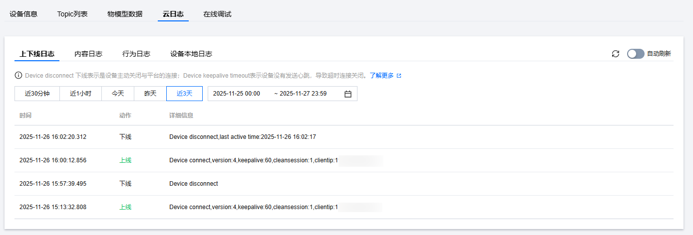 上下线日志 | 设备通过 MQTT 与物联网开发平台连接和断开的日志。 上线:连接成功。 下线:连接断开。 |