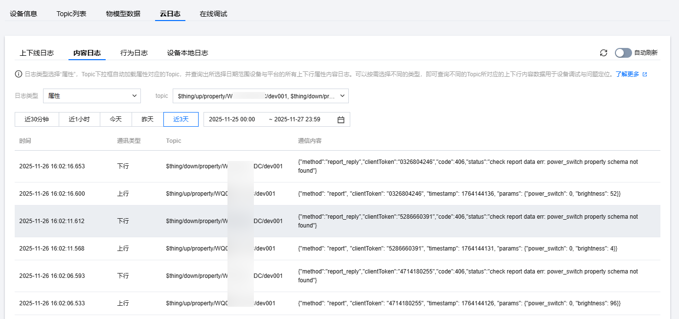 内容日志 | 设备使用 Topic 通过 MQTT 发布和订阅的消息内容,即设备上报平台的数据和平台下发到设备的数据。 |