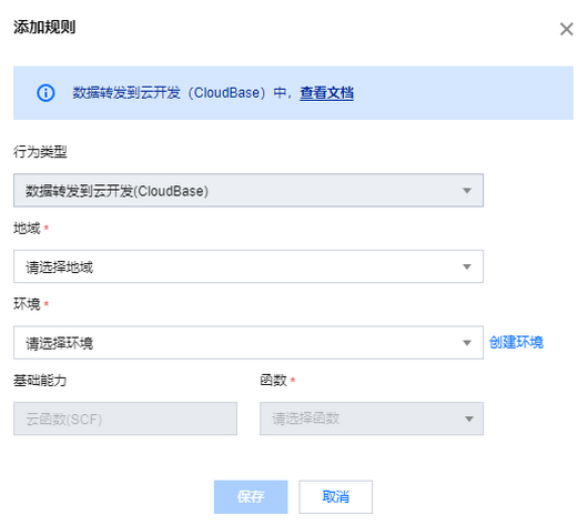 2. 在弹出的“添加规则”窗口,选择“数据转发到云开发(CloudBase)选项”,选择地域、建立好的环境与函数后,单击保存即可。