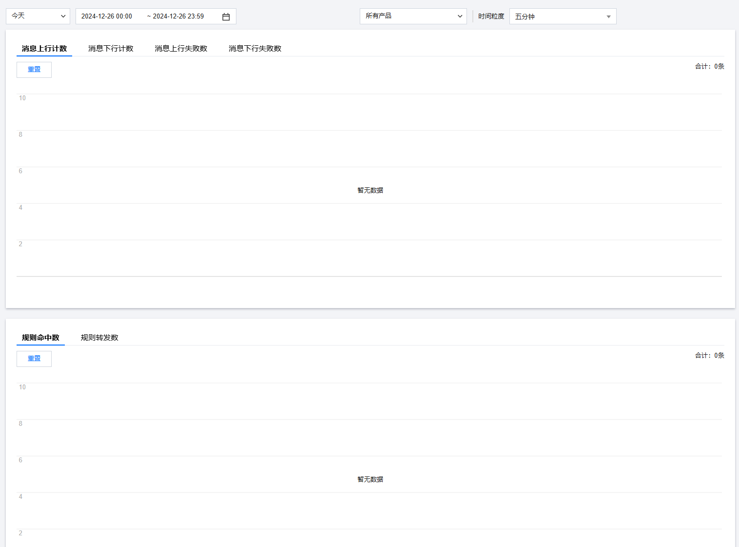 消息概览可查看所有产品或通过筛选某个产品来查看该产品的消息上行计数、消息下行计数、消息上行失败数、消息下行失败数、规则命中数和规则转发数。
