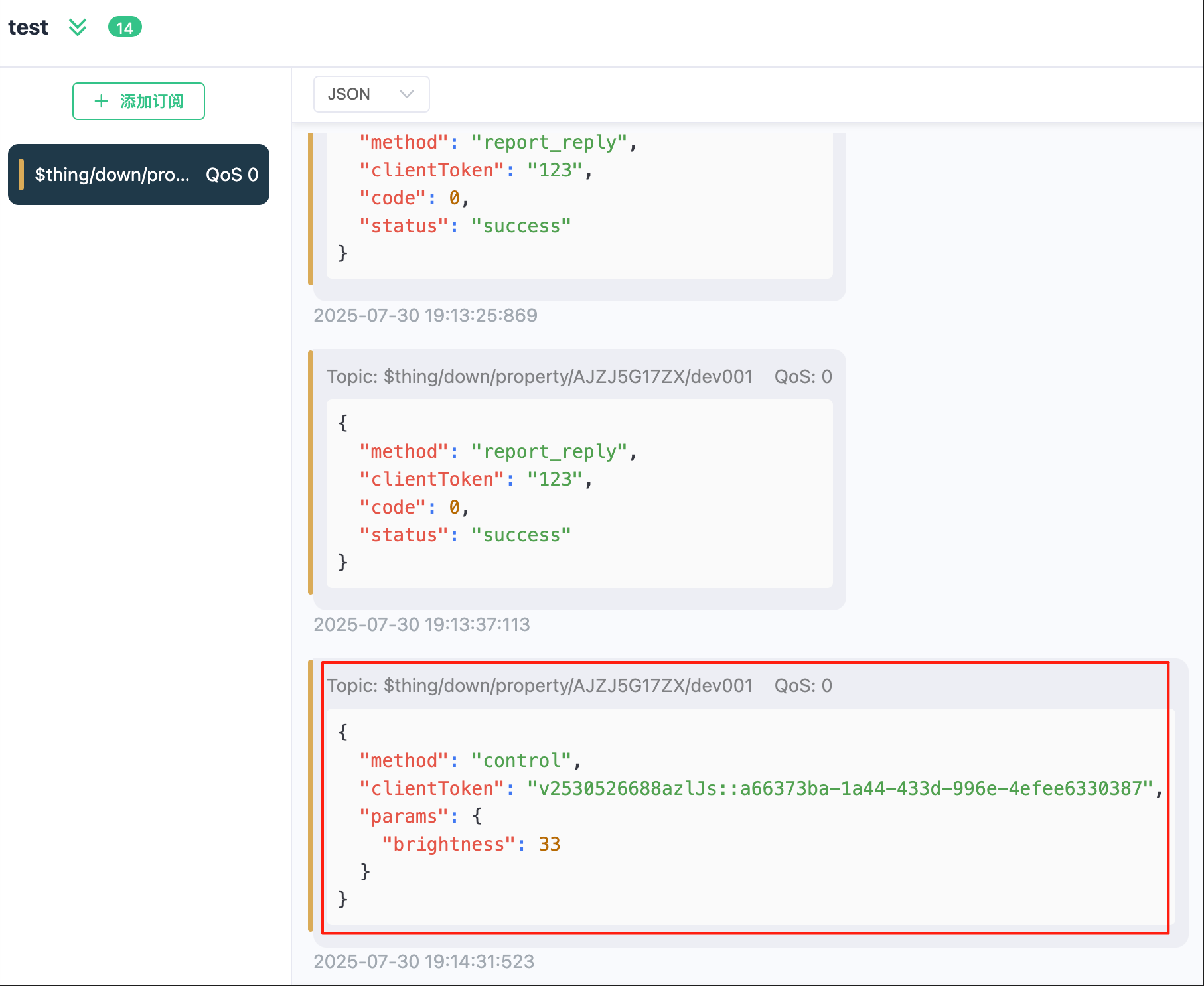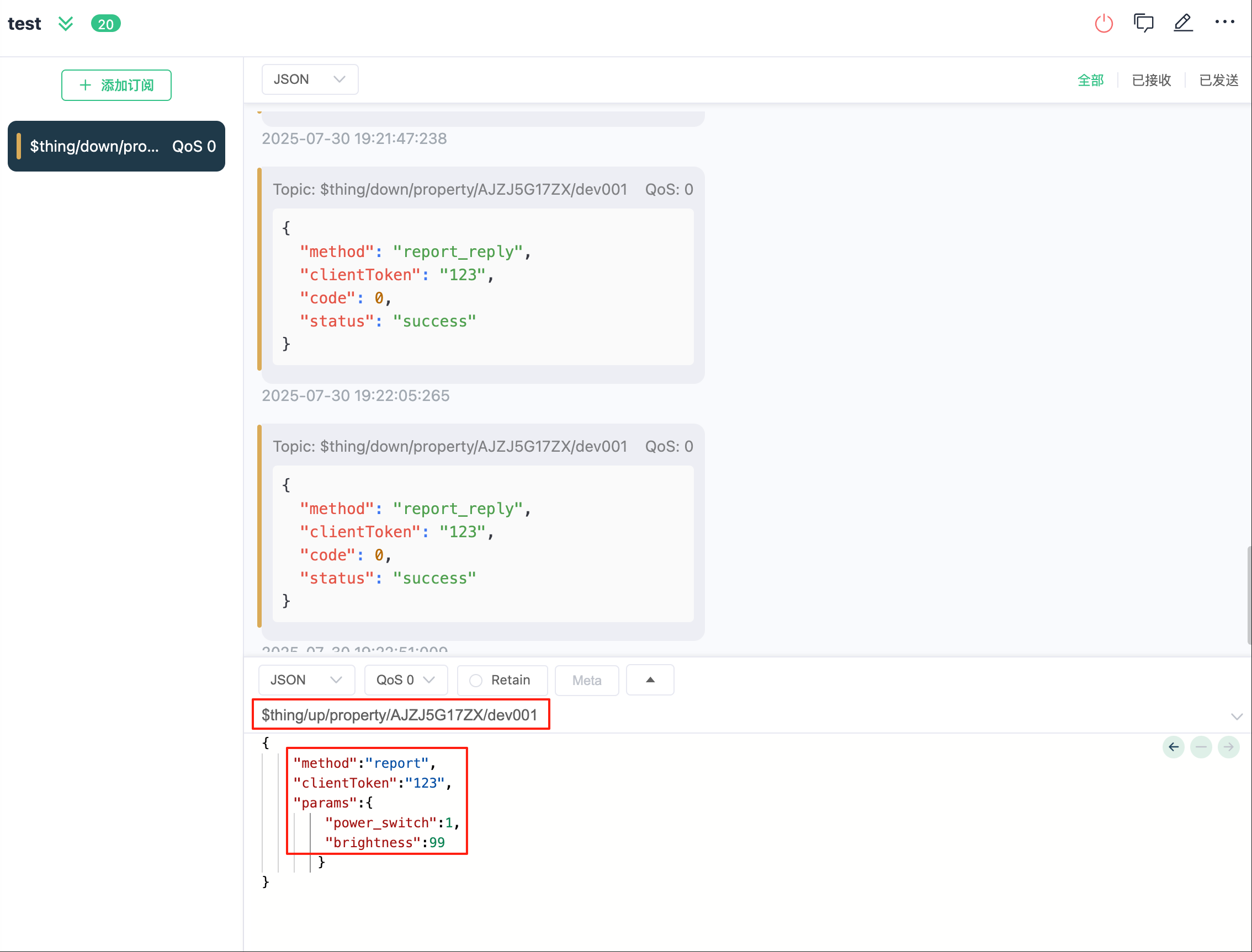 4. 同时也可查看 MQTTX 工具中订阅的物模型 Topic 是否有收到下发的内容指令。