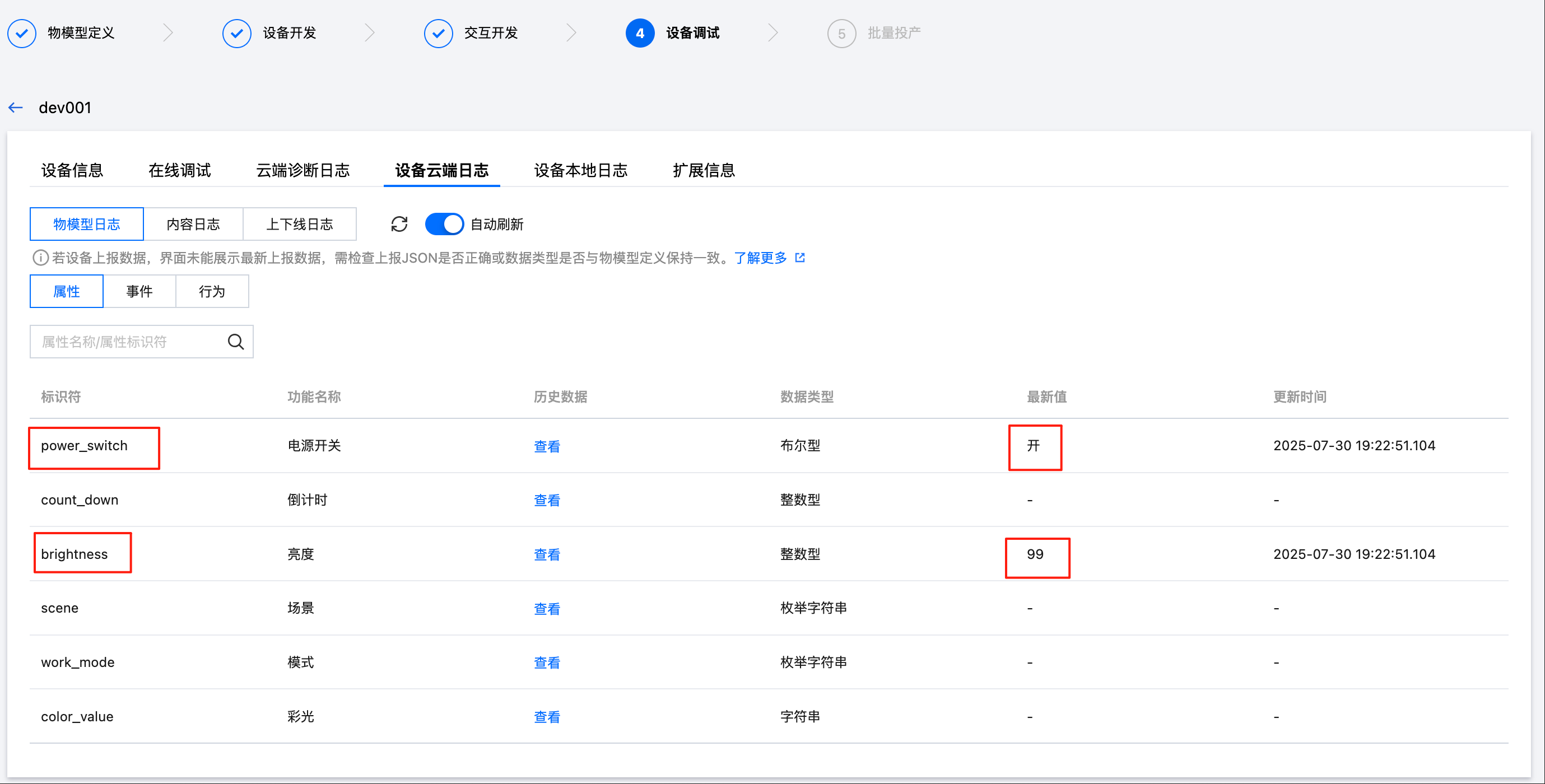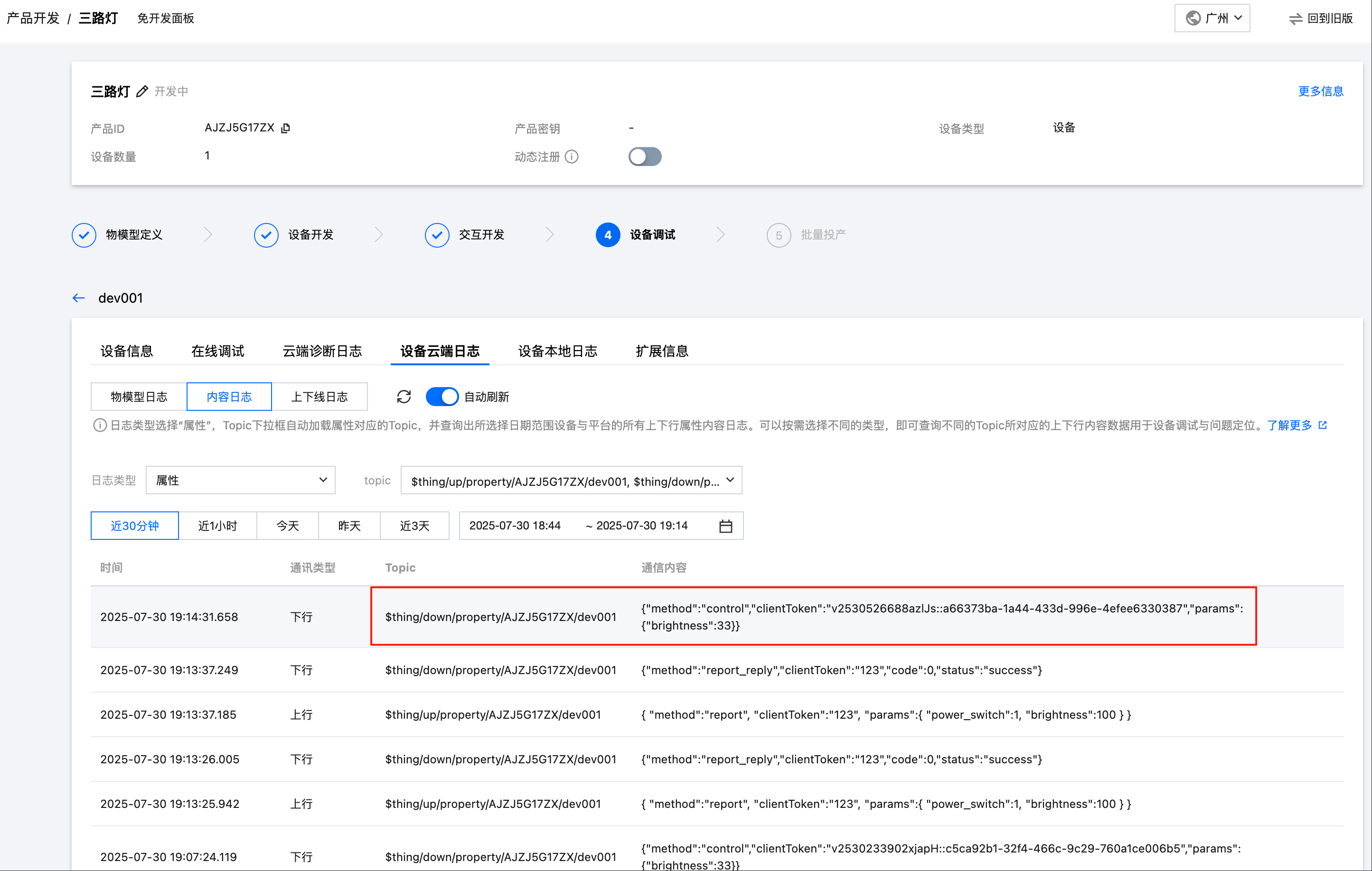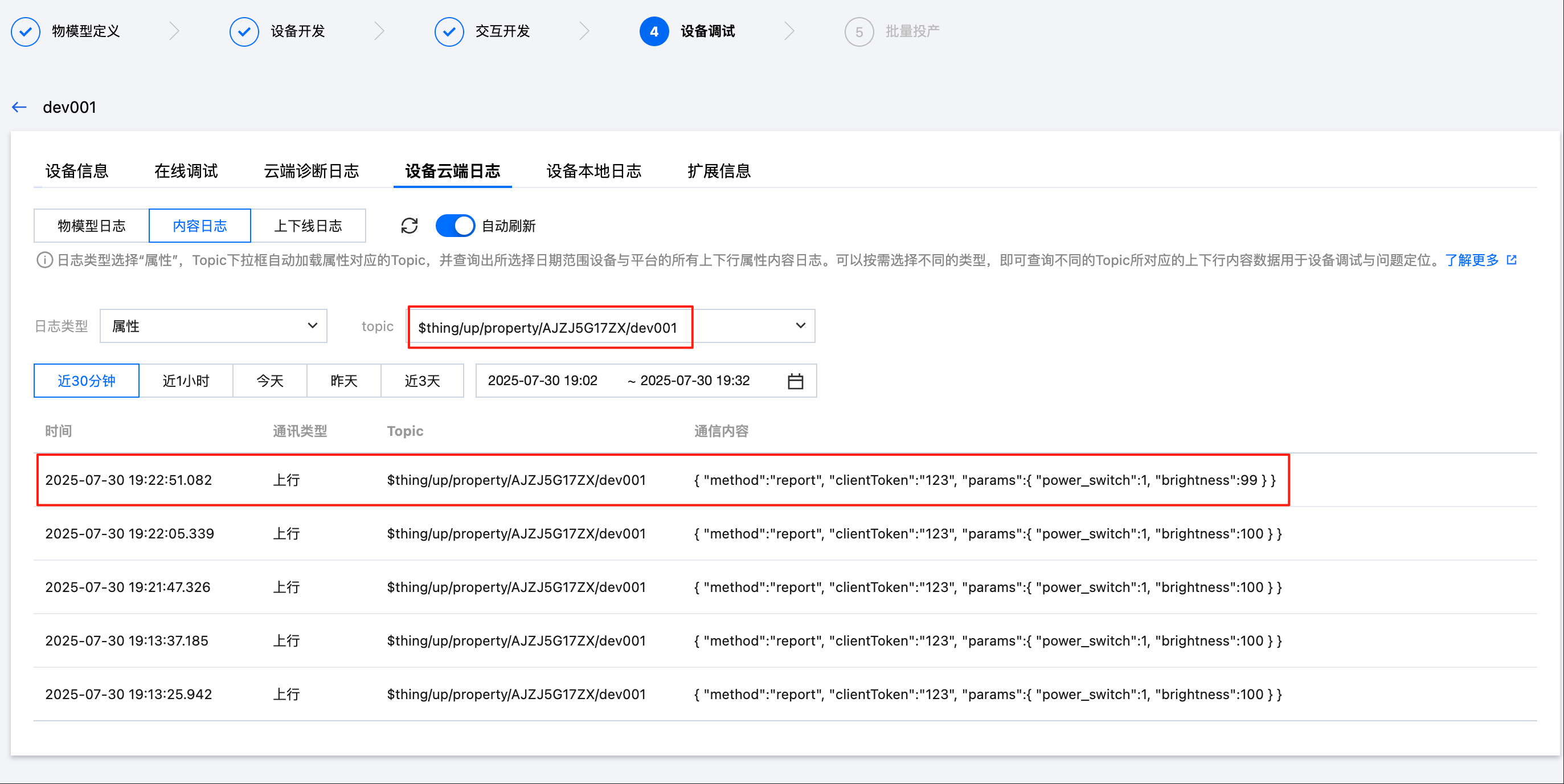 3. 发送成功后,返回至设备云端日志中验证通信内容是否有显示: