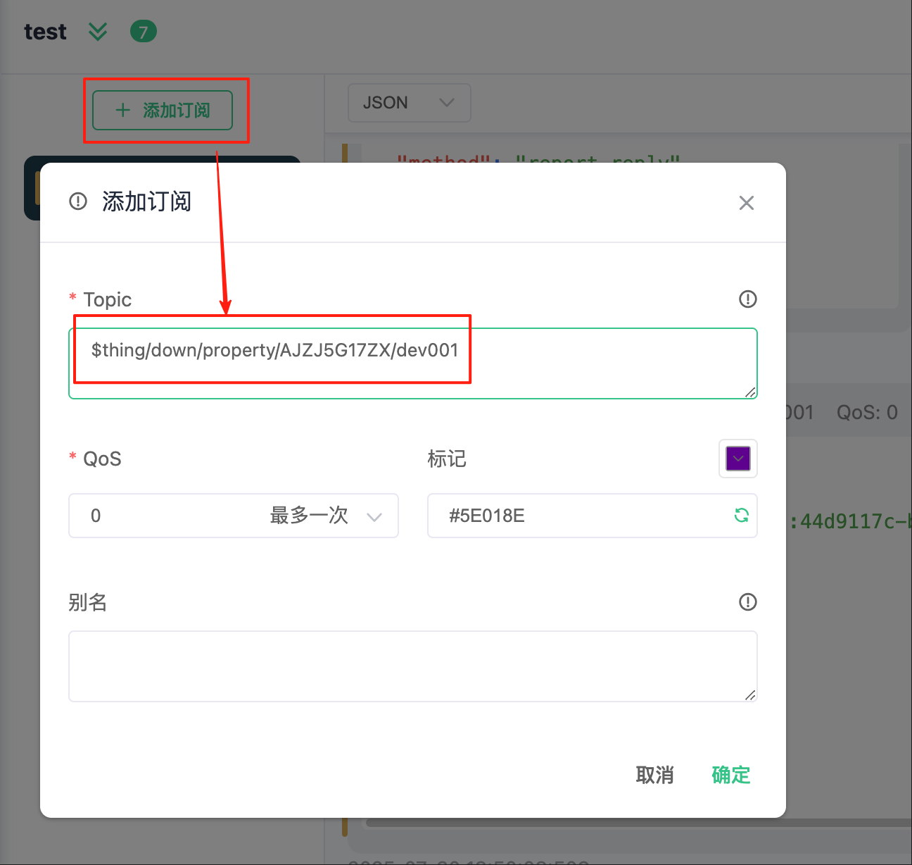 $thing/down/property/AJZJ5G17ZX/dev001(您订阅时,需更换成您自己账号所创建的产品 ID 与 DeviceName)
