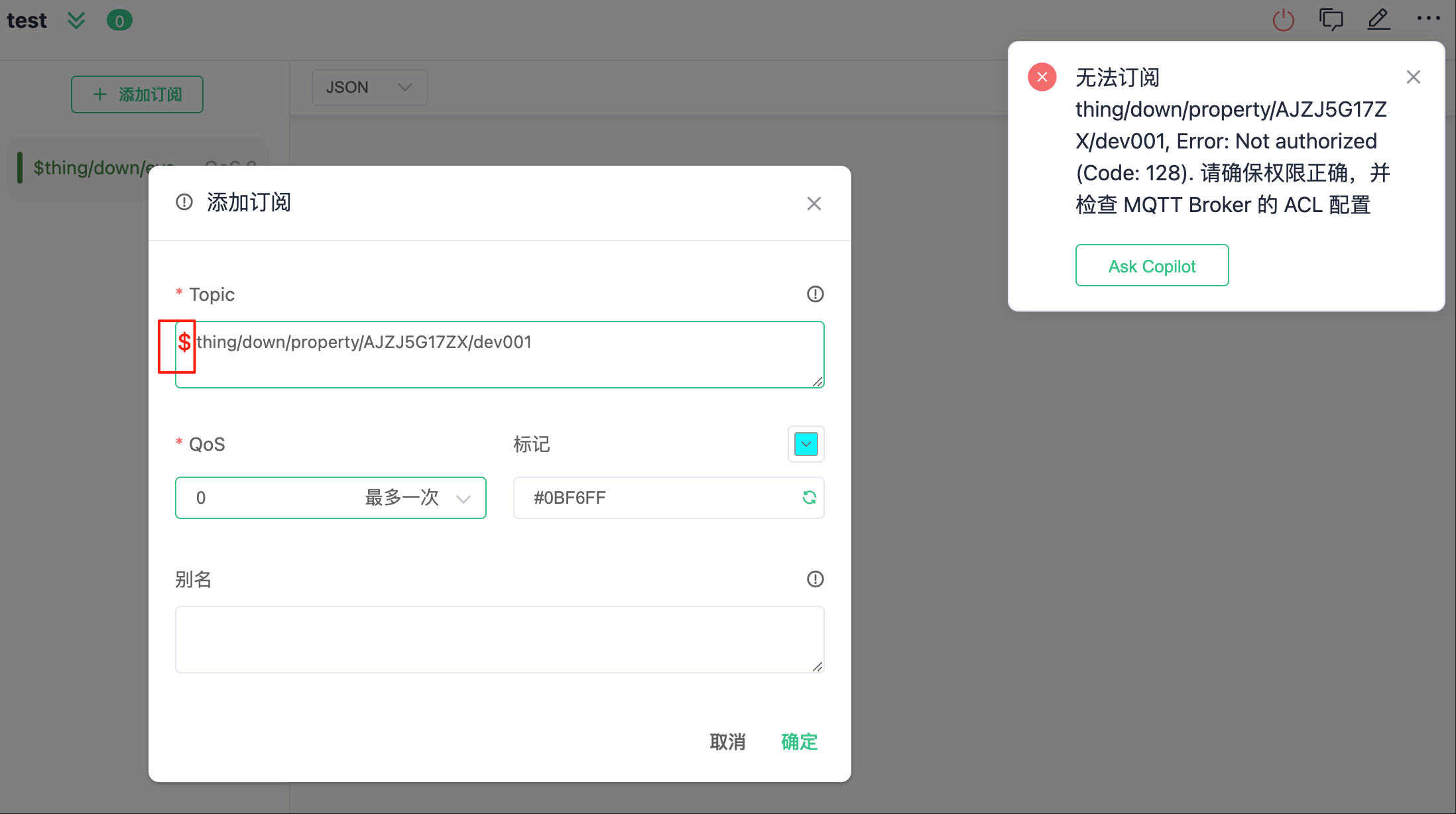 MQTT 工具提示无法订阅 Error:Not authorized(code:128),表示 Topic 字符串有误,需要检查是否添加“$”符号。