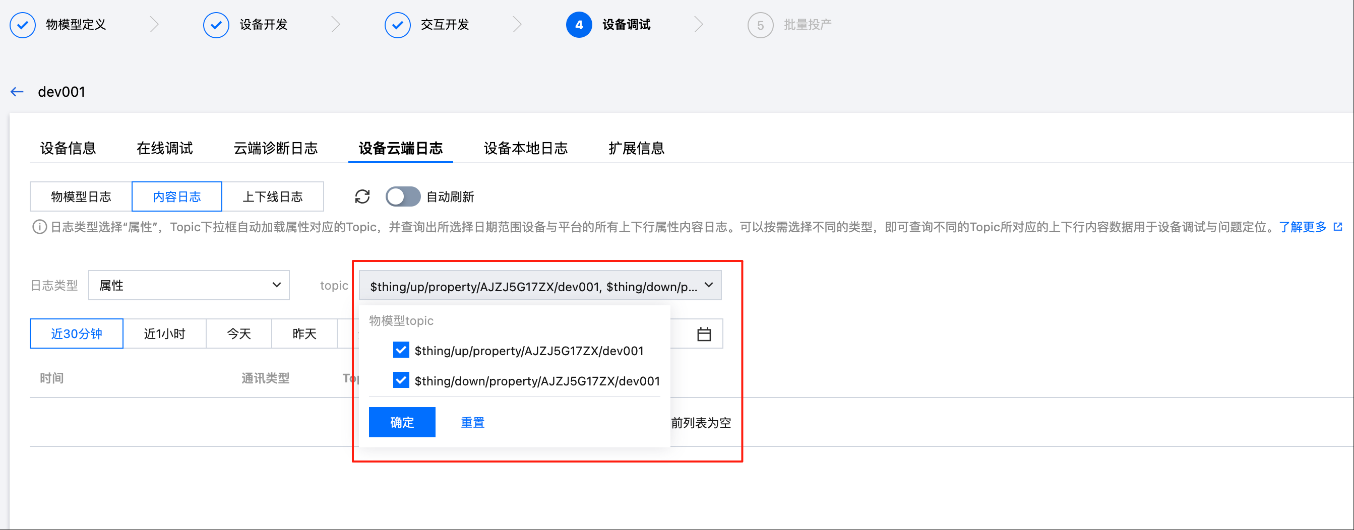 按 公共实例接入准备 文档创建智慧生活 > 电工照明 > 冷暖白光灯类别产品和设备,DeviceName 需创建一个为 dev001 的设备,如图所示,当设备成功连接平台,并向物模型 Topic 发布消息后,则可以在设备云端日志下的内容日志查看当前设备的物模型(属性/事件/行为)Topic 的日志。