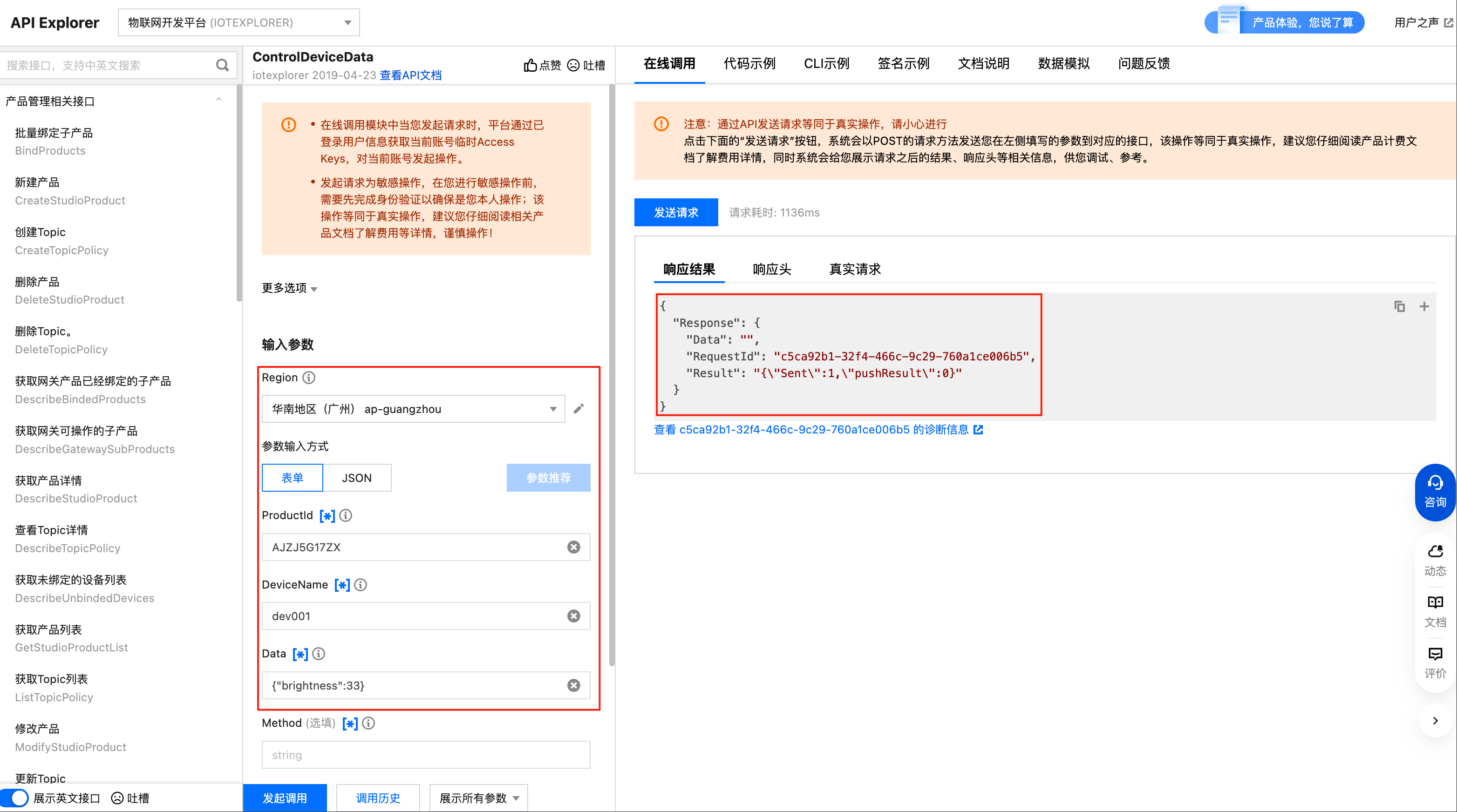 2. 打开 物模型指令控制 的云 API 进行在线调试,输入对应的参数后发起调用后,可查看响应结果。