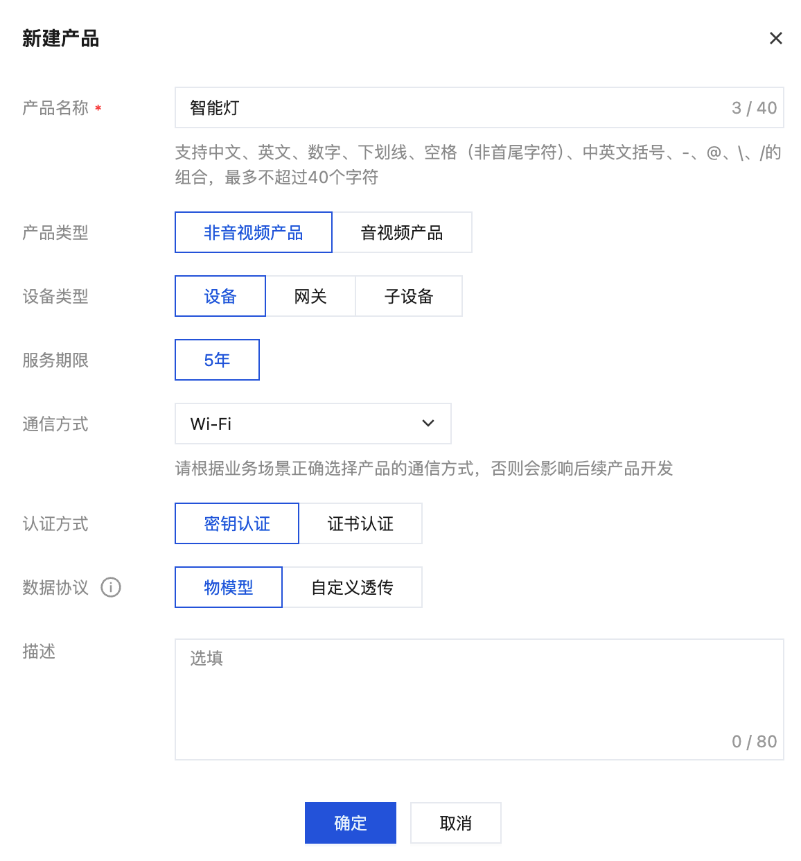 3. 单击新建产品,在新建产品页面,填写产品基本信息。以创建非音视频产品的智能灯为例: