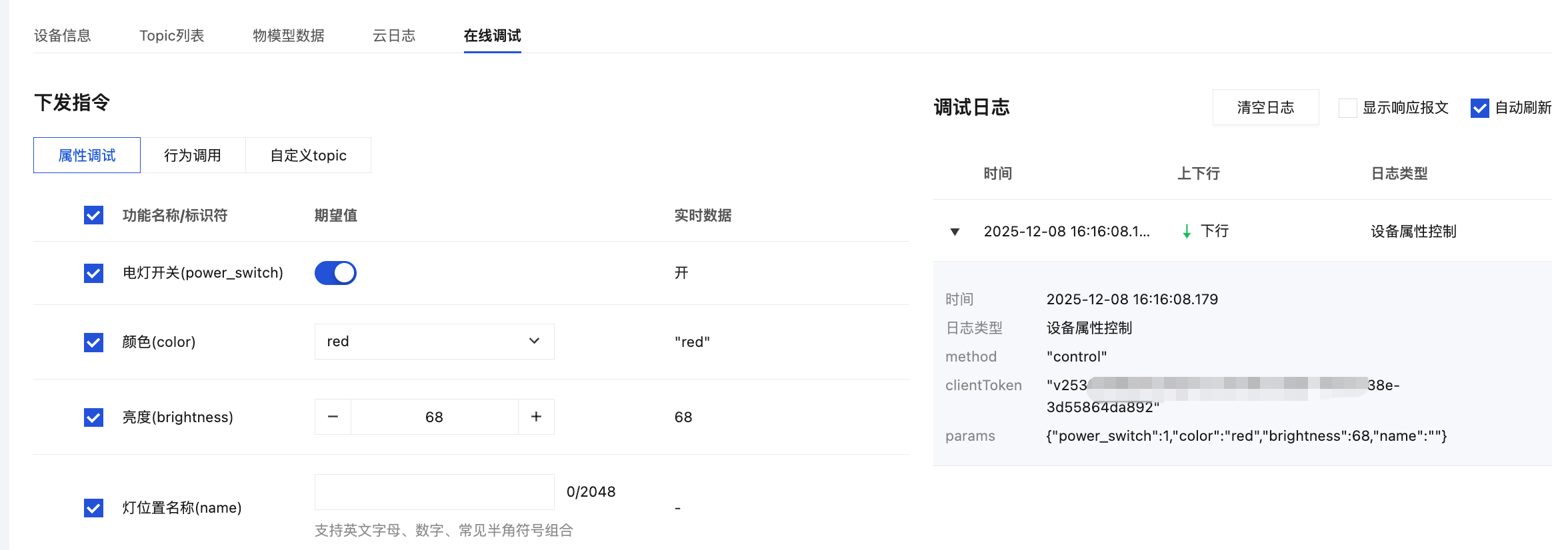 1. 当 Light Demo 成功连接到物联网开发平台后,您可在设备详情页的在线调试页面内进行调试。