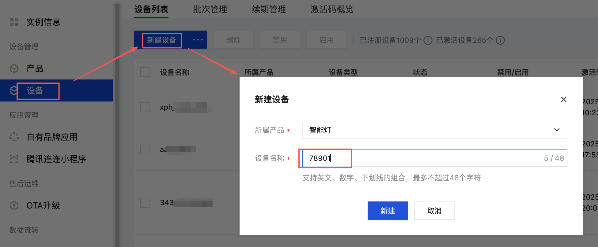 进入实例的设备页面,单击新建设备。选择所属产品“智能灯”,输入设备名称,然后单击新建。