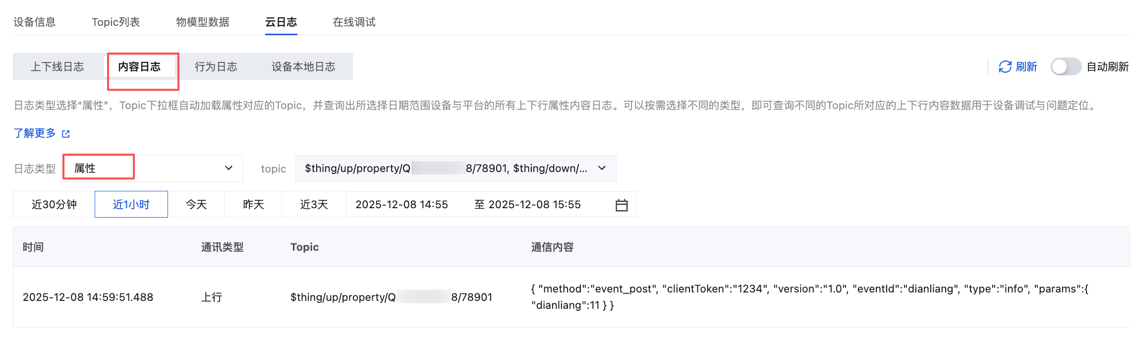 在设备详情页单击云日志,内容日志内可查询该设备某段时间范围的所有上下行数据。