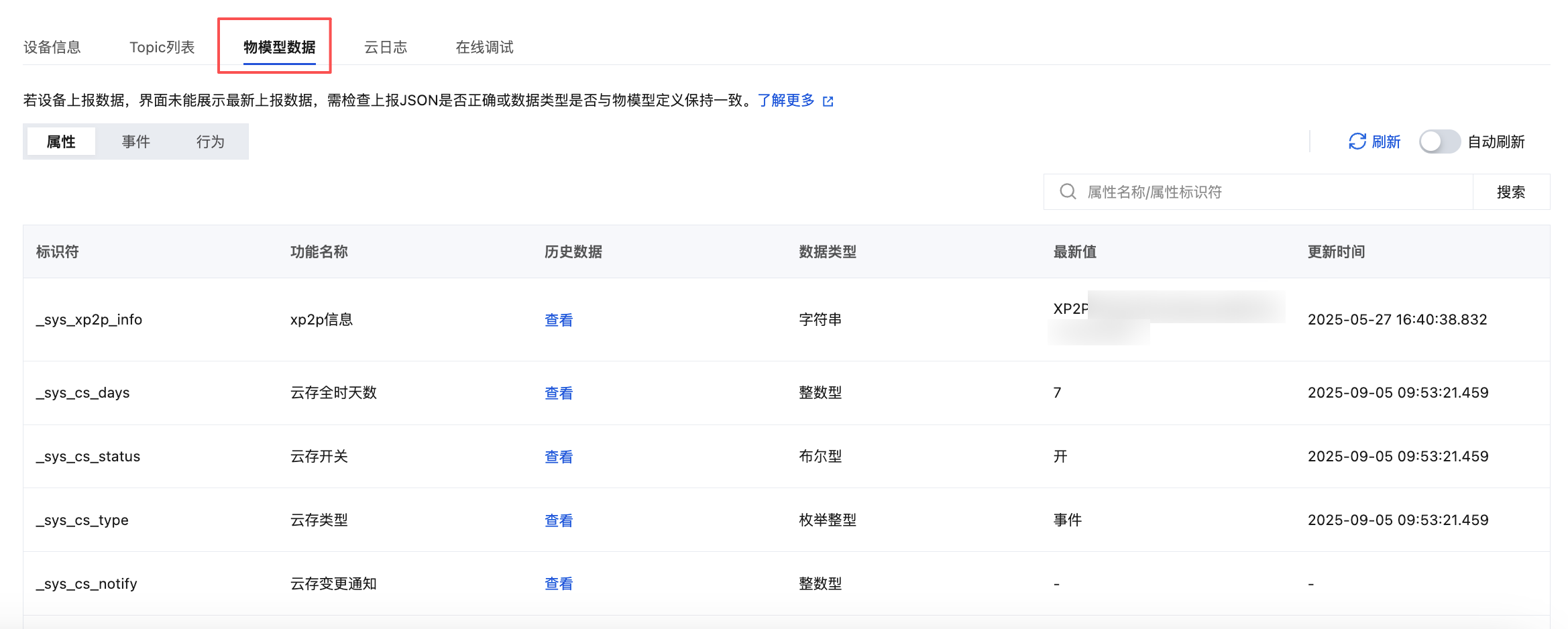3. 单击查看,进入设备详情页。然后选择物模型数据 > 属性,可查询设备上报到开发平台的最新数据及历史数据。