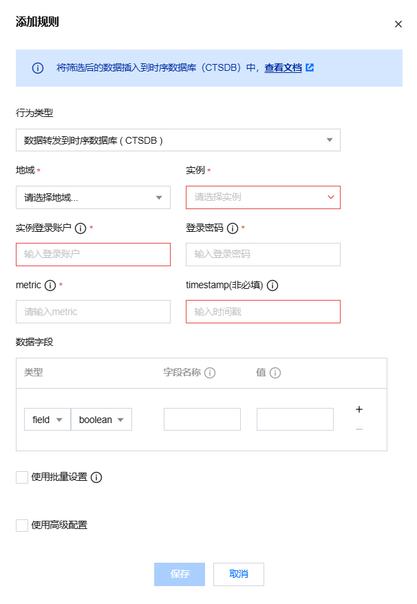 1. 授权成功后,在弹出的“添加规则”窗口,选择“数据转发到实序数据库(CTSDB)”,需要配置 CTSDB 实例信息和写入的字段信息,如下图所示: