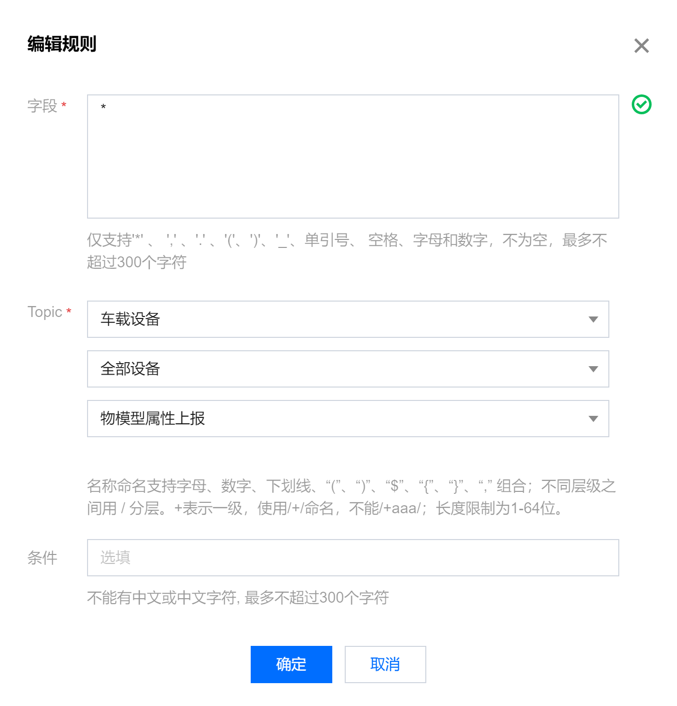 字段:输入"*" ,表示将设备上报的所有 JSON 数据进行转发。