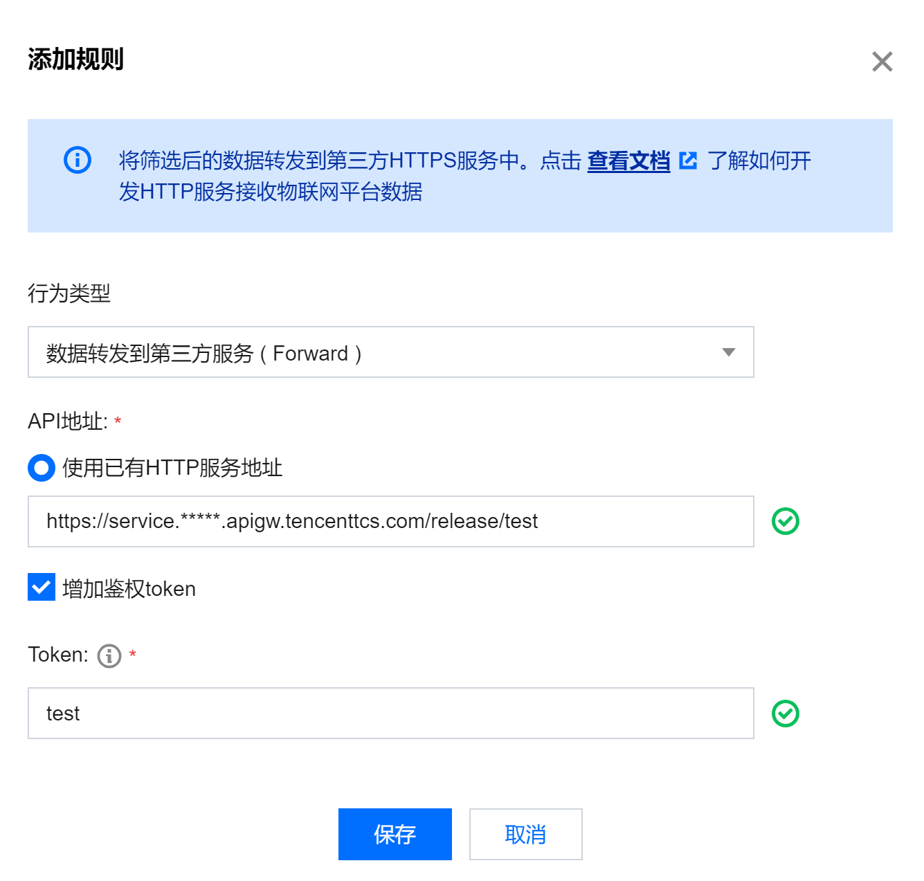 2. 下图行为类型选择“数据转发到第三方服务(Forward)”、选择 API 地址类型选择“使用已有 HTTP 服务地址”。HTTP 地址则为 此步骤 中复制 SCF 自动生成的 URL 地址,并在最后加上
