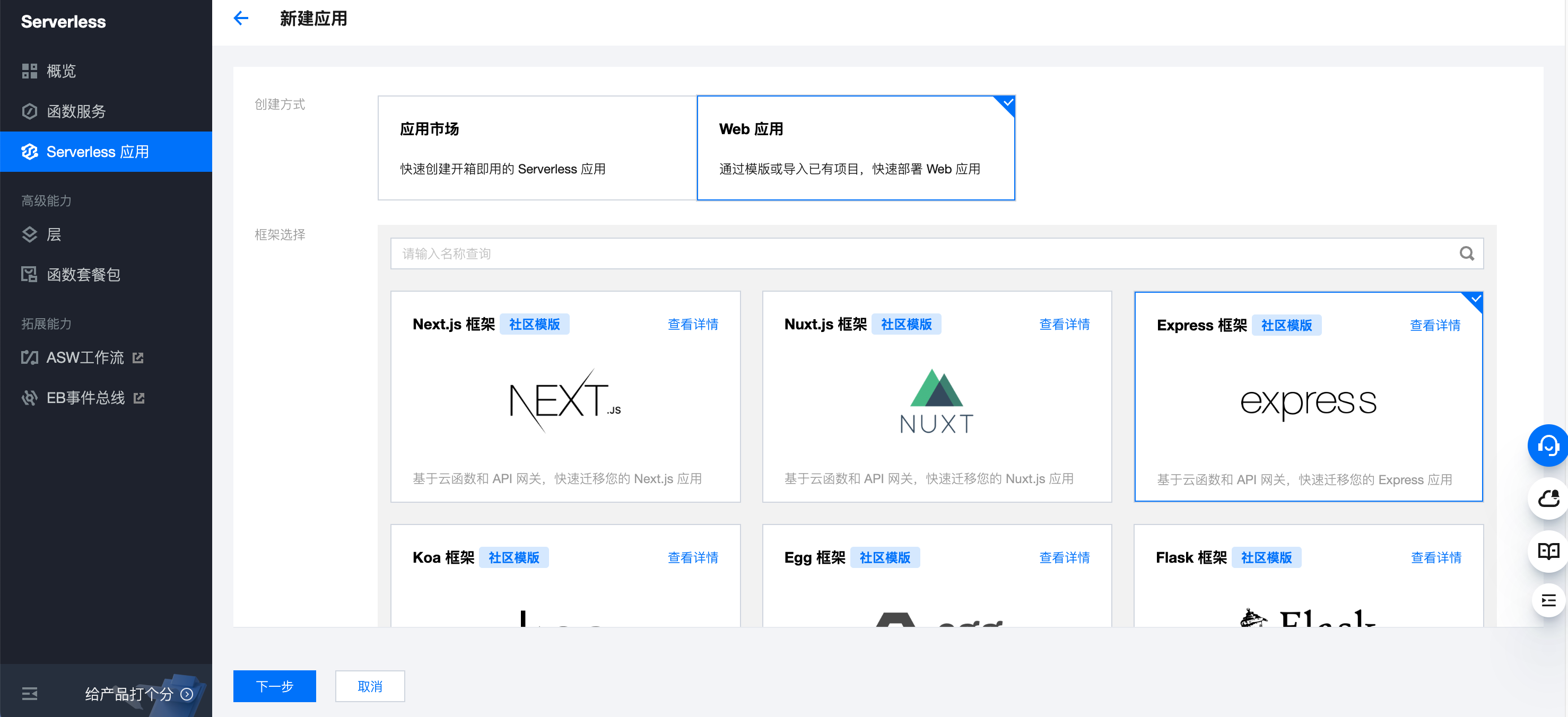 2. 选择 Web 应用下的 Express 框架模板,单击下一步。