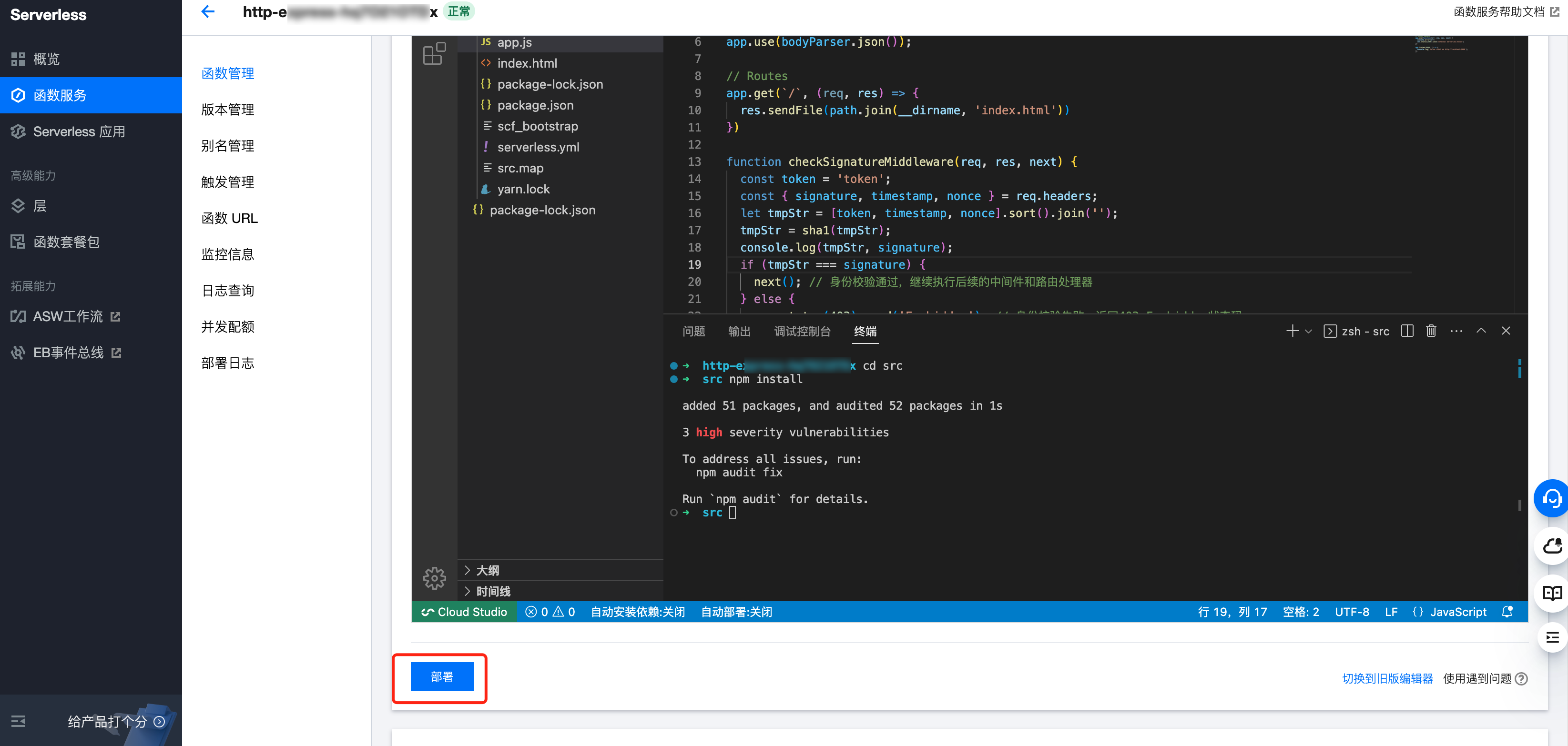 7. 等待依赖安装完成之后,单击下图红色线框中的部署,即可成功部署 Web 服务,SCF 会自动启动该 Web 服务,约5秒 - 10秒后系统会提示“部署成功”。