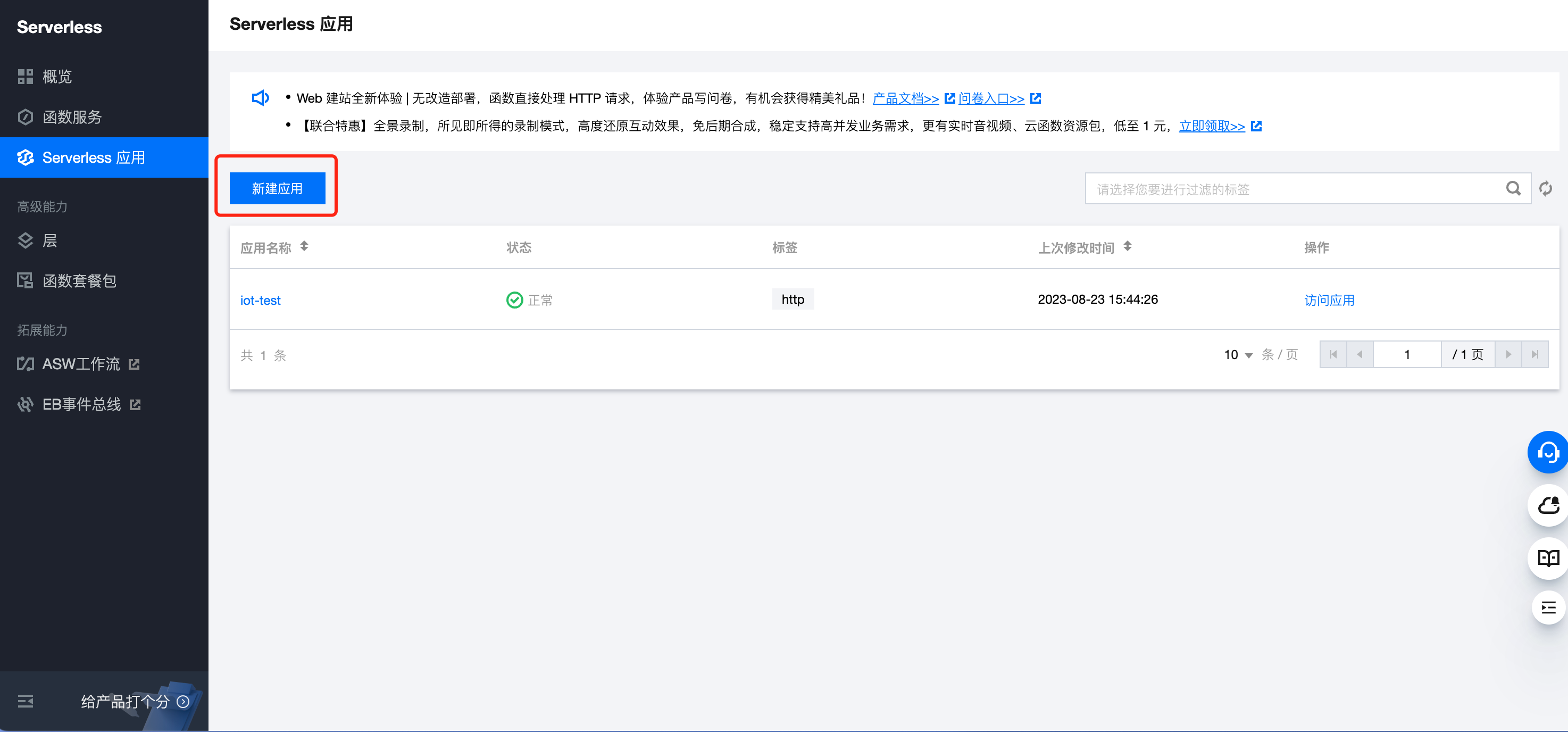 1. 登录 SCF 控制台,选择 Serveless 应用,单击新建应用。