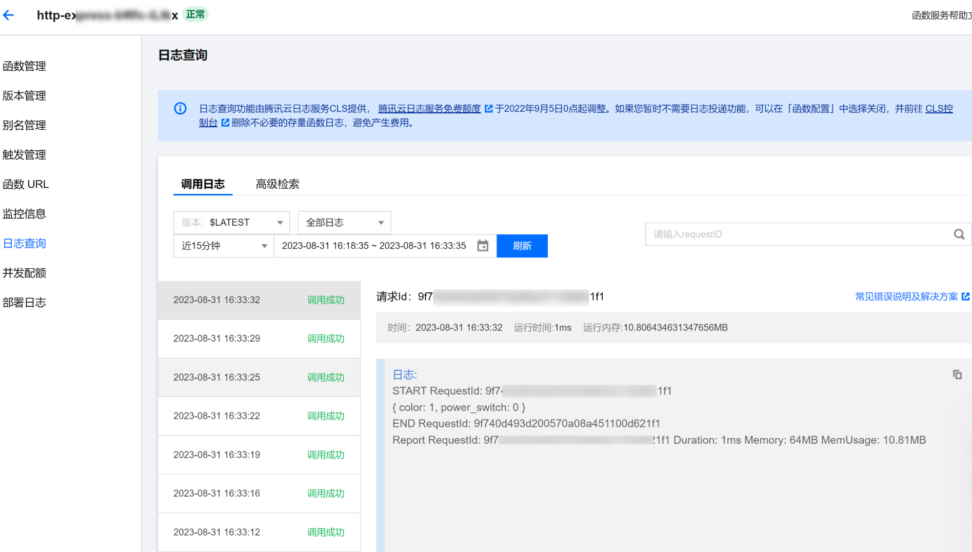 2. 进入 SCF 的函数服务,单击日志查询,可查看到 SCF 打印的日志,可完整打印出设备上报的物模型属性。