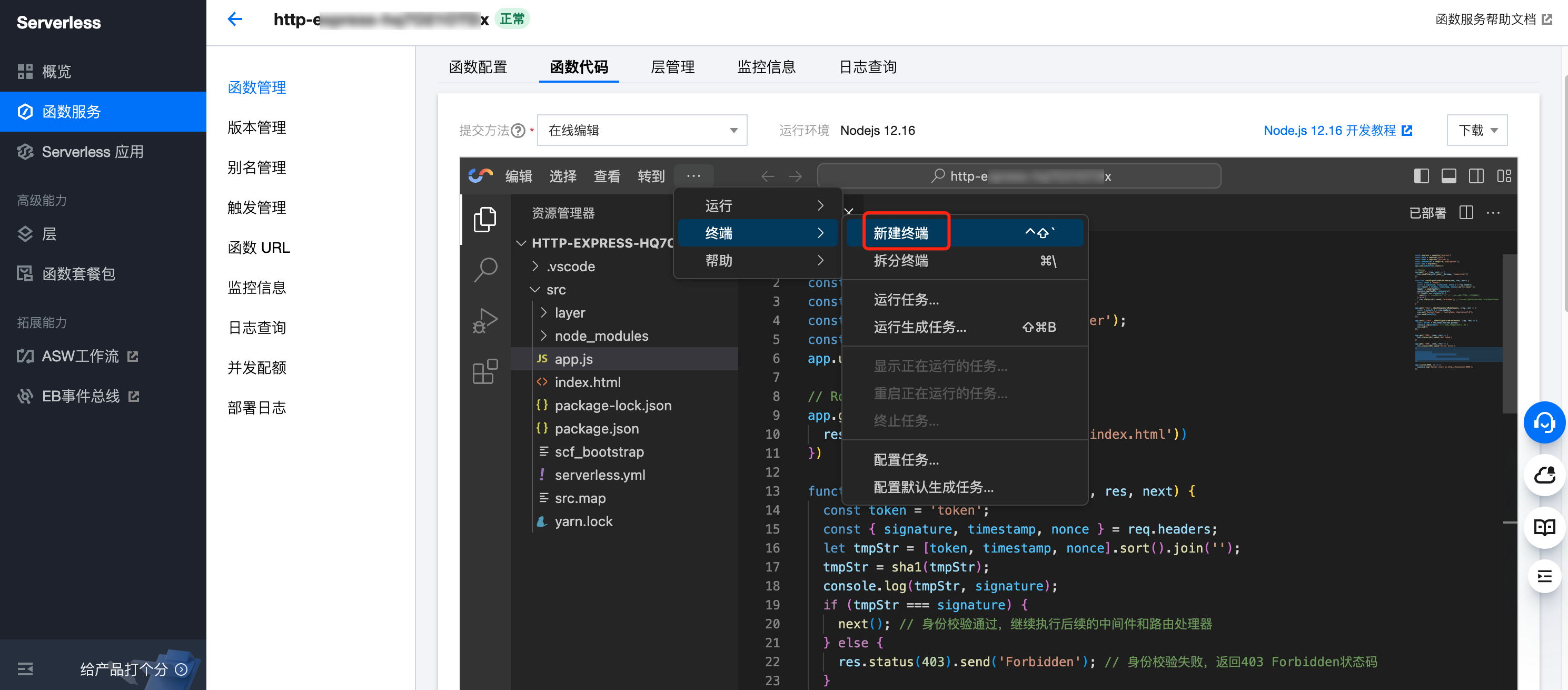 6. 上述步骤完成后,需要引入两个依赖包,分别是 body-parser 与 js-sha1。在代码编辑器的上方选择终端 > 新建终端,然后在底部终端中输入命令: