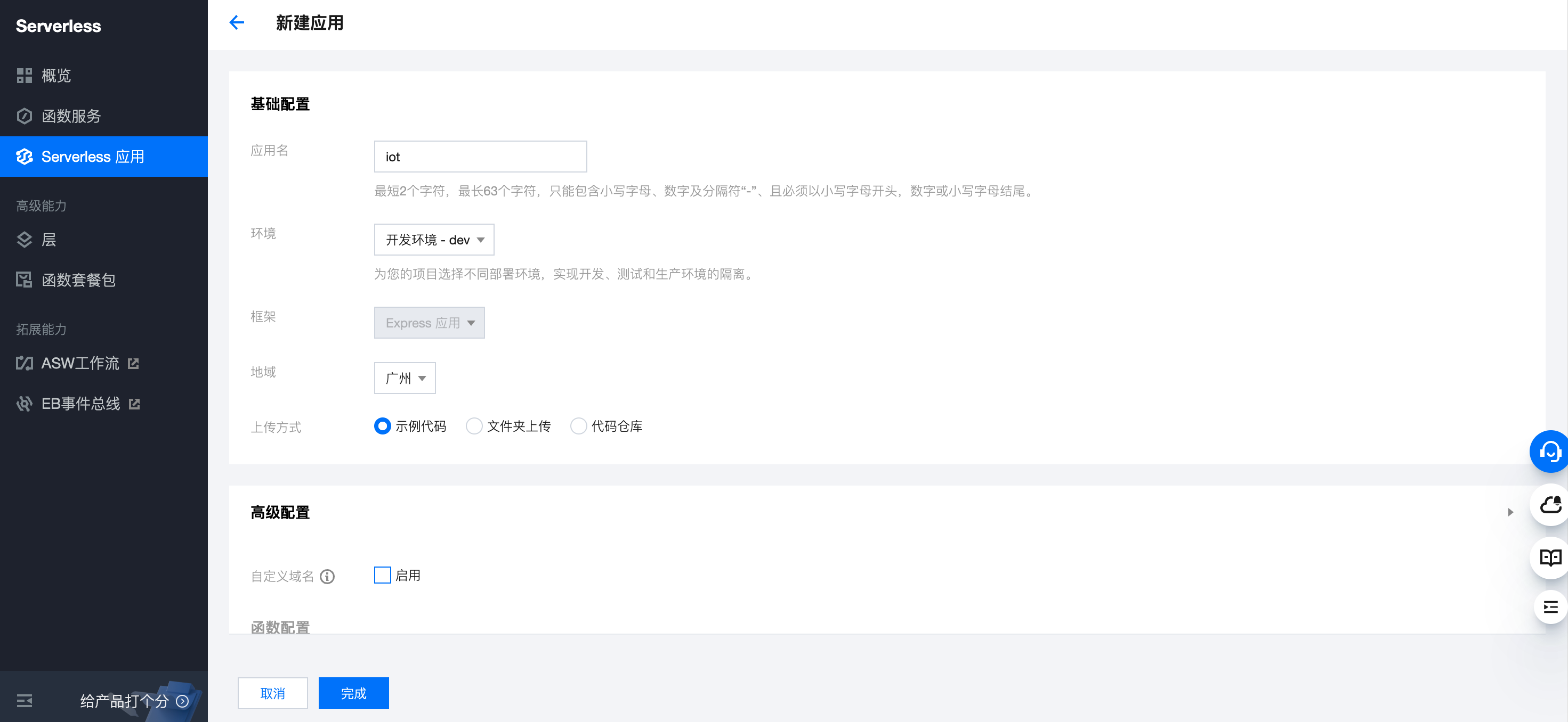 3. 按下图所示输入应用名,选择环境、地域,上传方式。配置结束后单击完成。