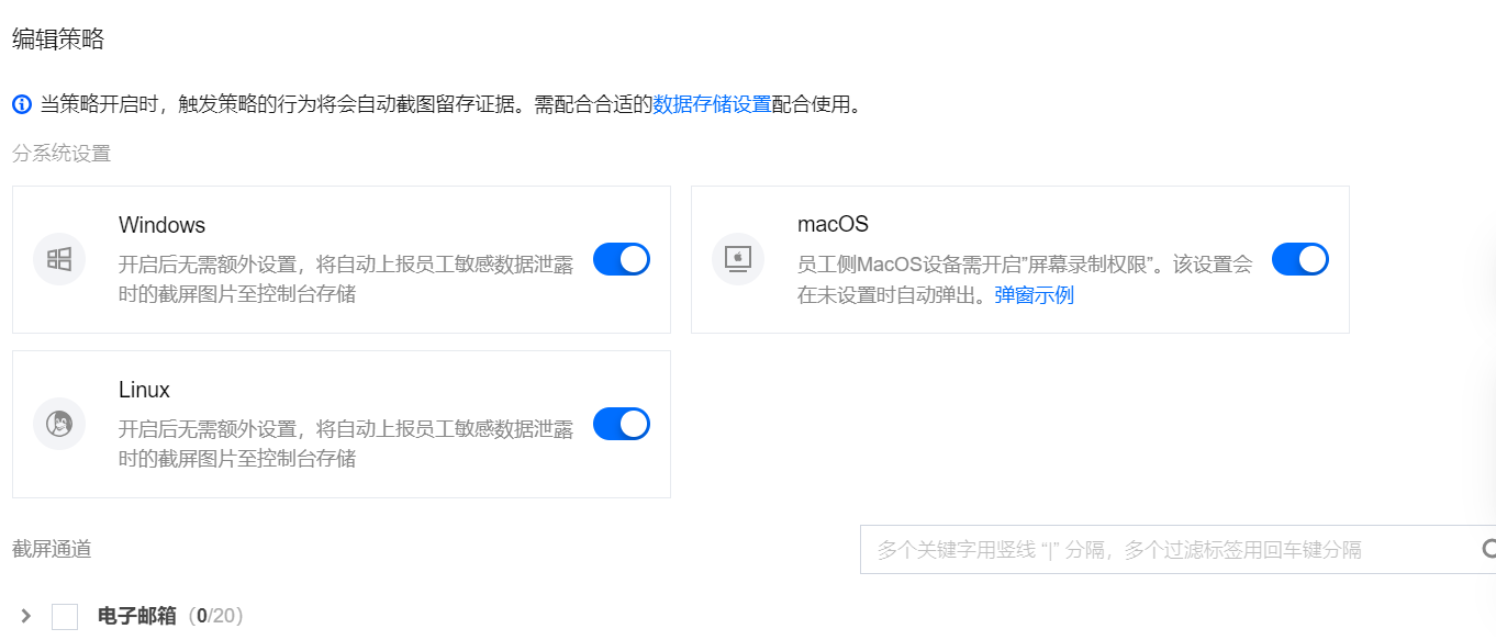 开启 Windows/macOS/Linux 的截屏取证策略,开启后,触发策略的行为将会自动截图留存证据。需选择合适的 数据存储设置 配合使用。