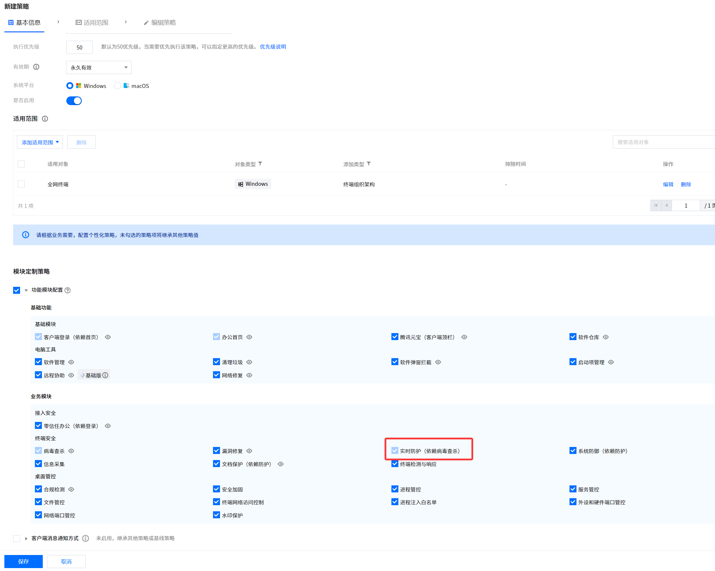 5.1 管理员在终端管控策略 > 客户端管理 > 模块定制中开启实时防护开关。