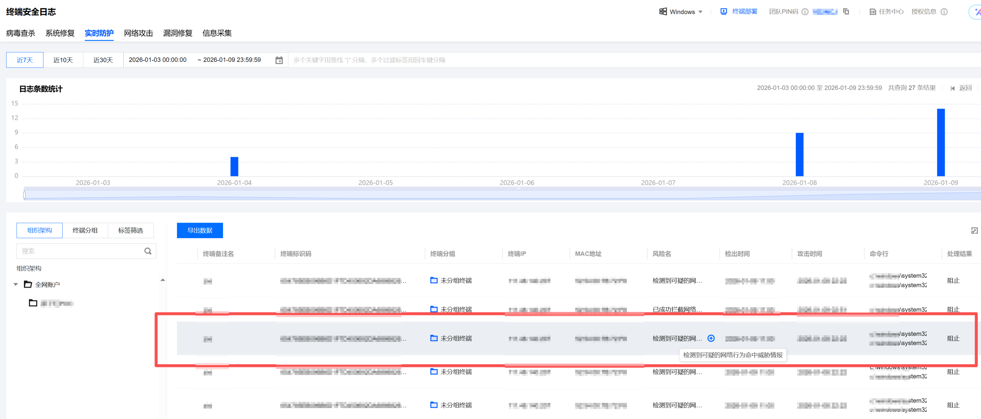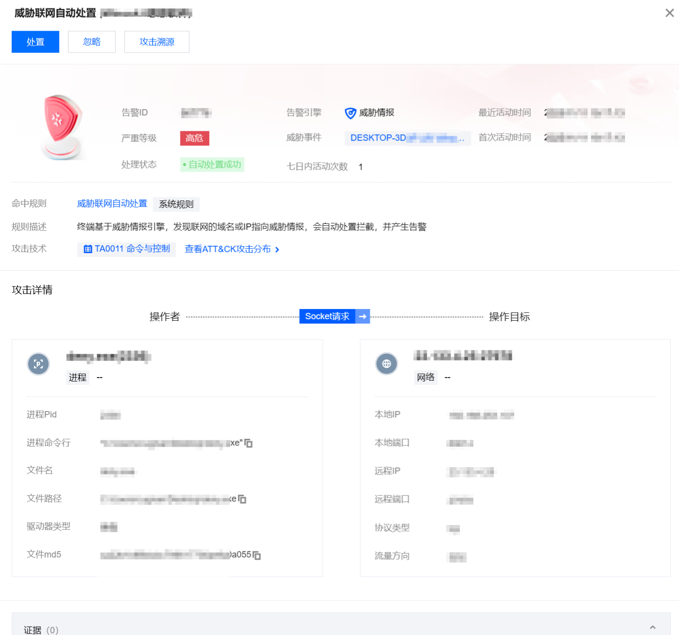 5.2 用户访问恶意 IP、域名,IOC 联动腾讯威胁情报中心,阻断访问,触发告警。