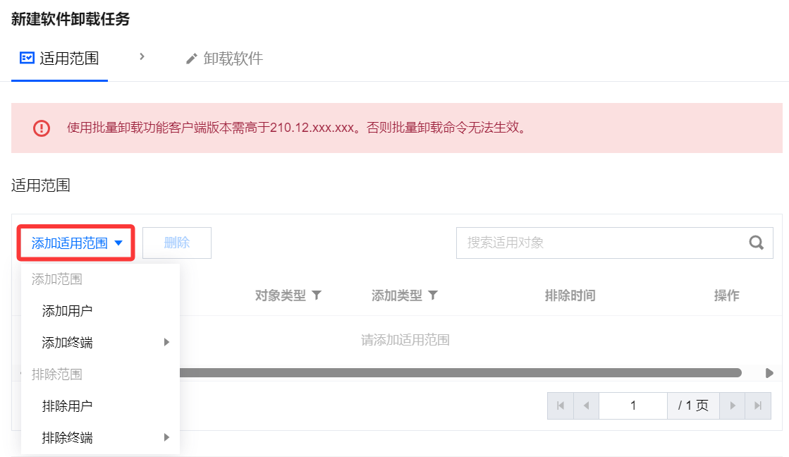 3. 单击添加适用范围,勾选需管控/排除的用户/终端名称,单击确定。