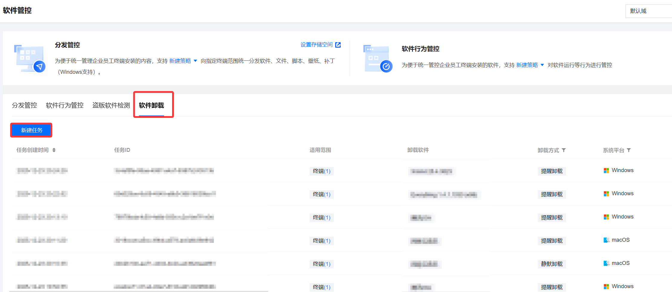 2. 在软件管控页面,选择软件卸载,单击新建任务。