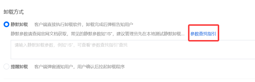 静默卸载:输入静默卸载参数,例如 “/S”,可通过“参数查找指引”查看静默卸载方式。