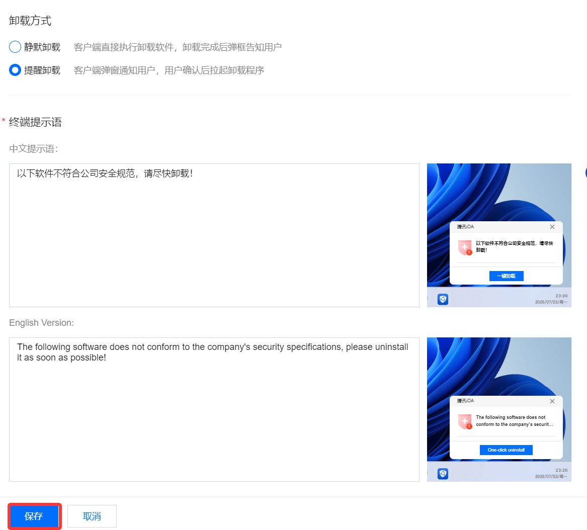 提醒卸载:选择提醒卸载并配置终端提示语后单击保存,客户端弹窗通知用户,用户确认后系统执行卸载程序。