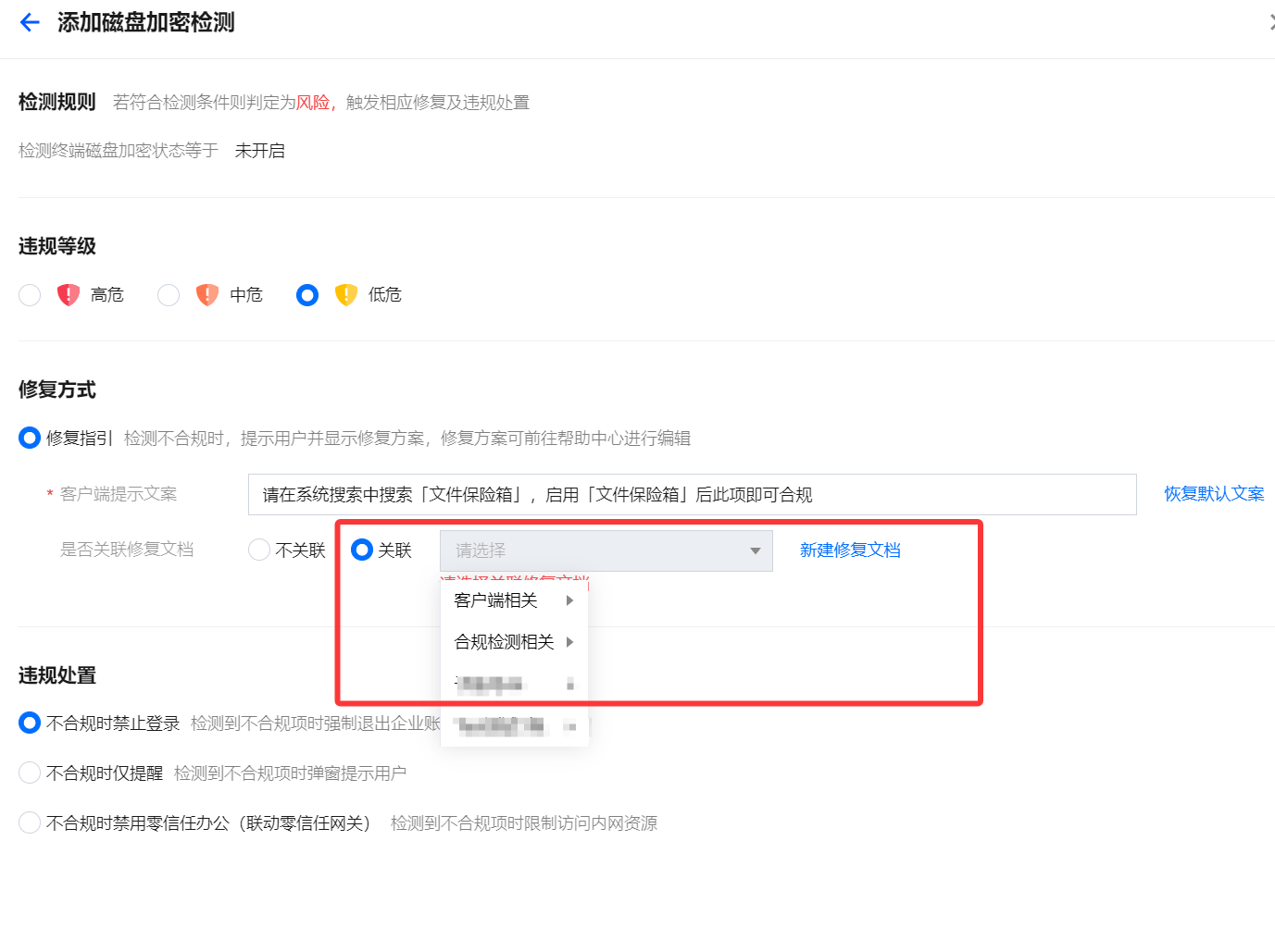 7. 前往终端管控策略 > 合规检测 > 合规检测策略,配置修复指引时关联帮助中心的文档。