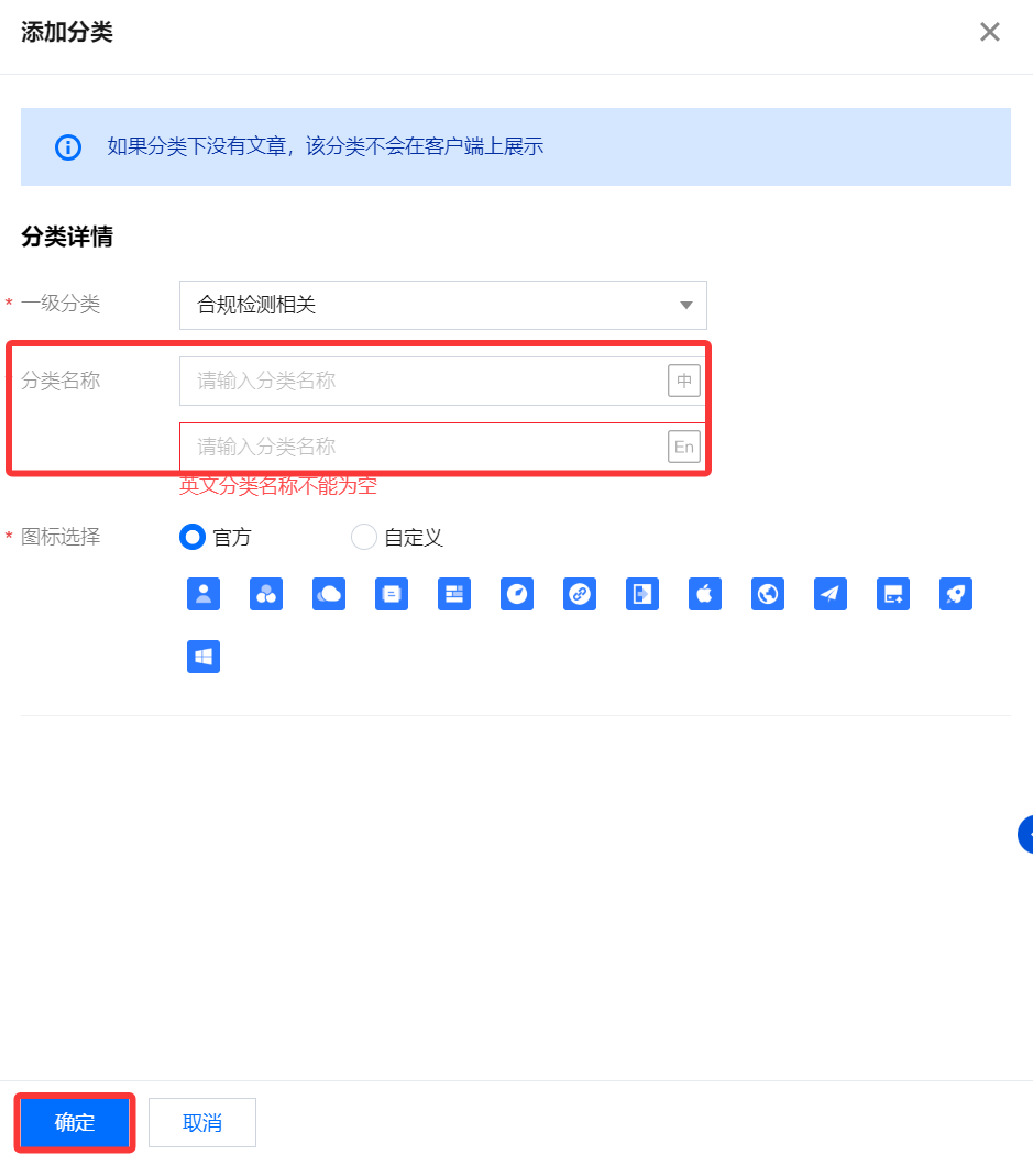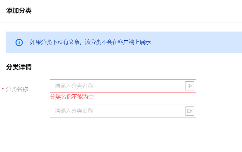 3. 添加分类:单击添加分类,填写分类的中英文名称。