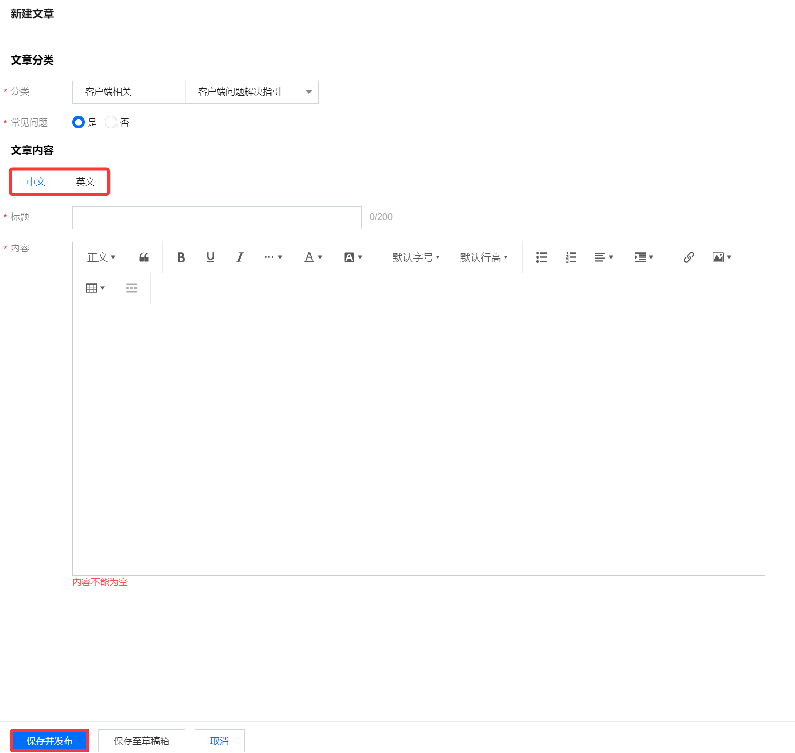 6. 在新建文章页,填写文章分类、文章内容等信息,并将文档内容的中/英文配置完成后单击保存并发布。