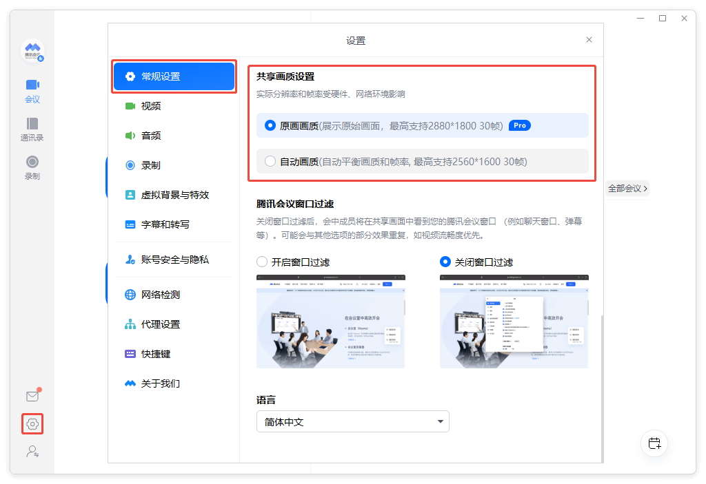 您可以单击客户端主界面设置 > 常规设置 > 共享画质设置中选择原画画质、自动画质,(首次默认选中自动画质),勾选够将会记忆您的选择,并在后续会议中生效,支持在会中针对本场会议进行修改。