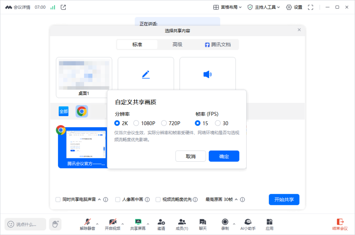 2. 会中支持自定义共享画质,单击自定义即可设置分辨率、帧率。