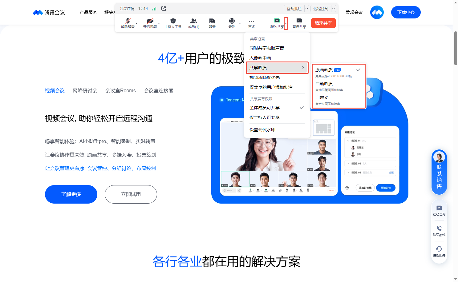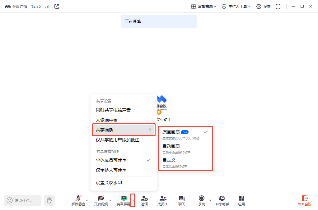 您可以单击底部工具栏共享屏幕旁的向上箭头 > 共享画质,选择所需要的画质,即可对本场会议生效。
