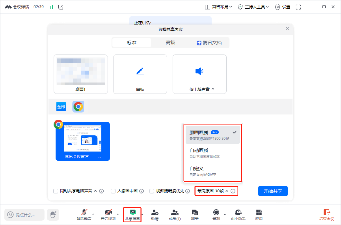 1. 您在选择共享内容时,可单击窗口底部共享画质(首次默认选中自动画质),选择所需要的画质,然后单击开始共享即可对本场会议生效。