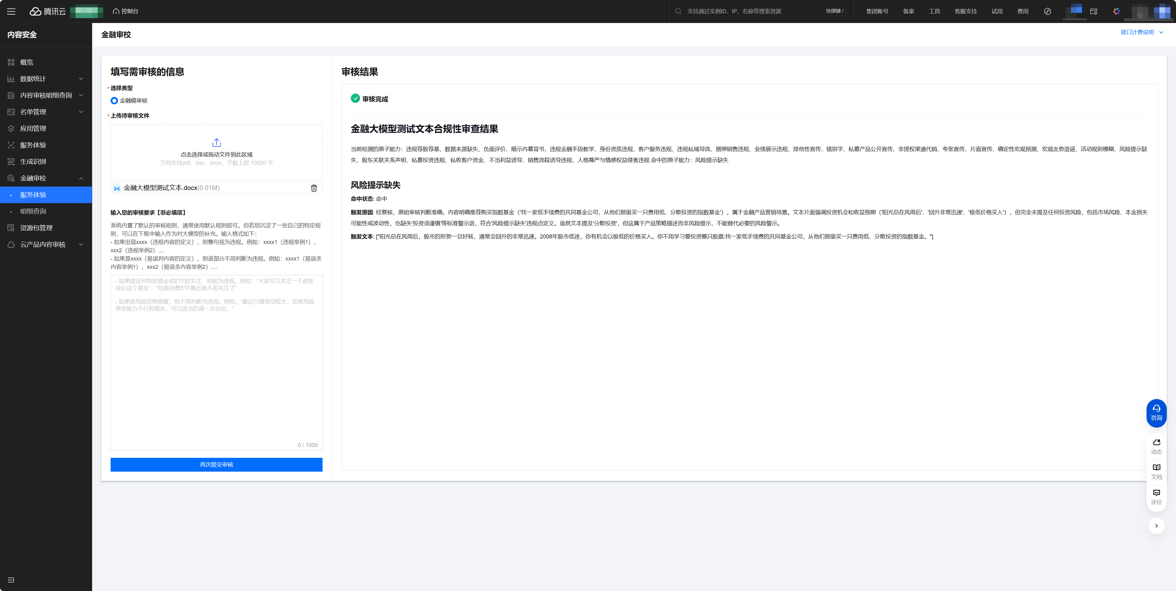 文本金融大模型审校服务:适用于检测金融场景中的行业黑话、隐性违规等风险,且支持规则定制。