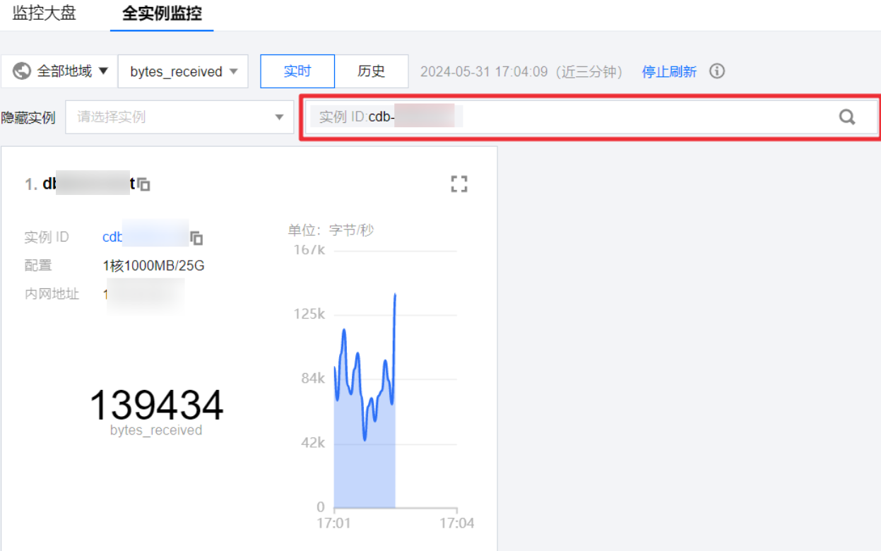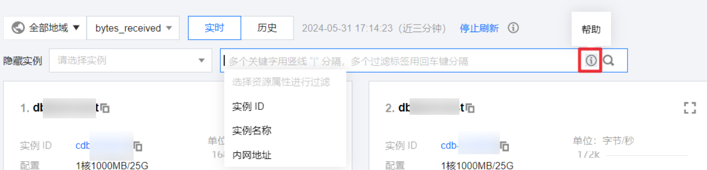 通过关键字筛选查看:可选择资源属性,通过实例 ID、实例名称等关键字筛选查看实例监控信息。