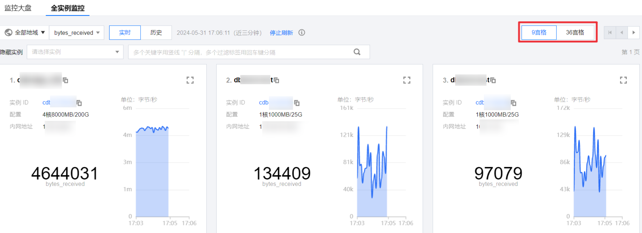 9宫格或36宫格显示监控图表:可在页面右上方切换9宫格或36宫格显示监控图表,用户实例较多的情况下建议使用36宫格视图,全局视角更明显,用户也可以更清晰地查看监控指标的波动状态。