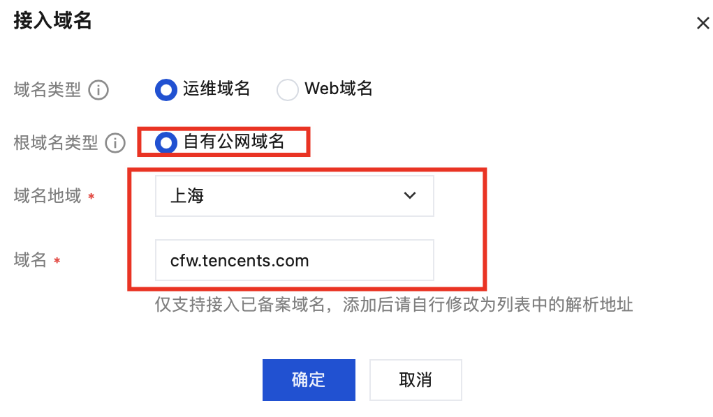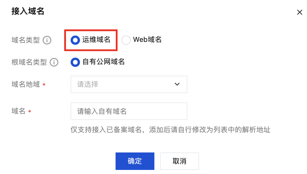 自有域名绑定:请确保填入的域名已备案,否则可能无法正常接入。